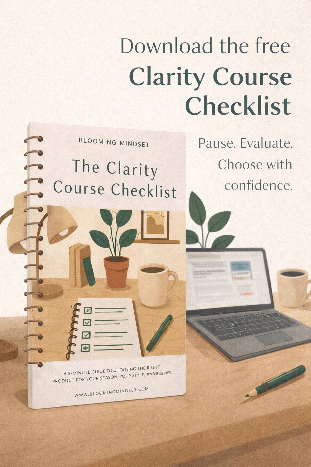 The Clarity Course Checklist helps you pause, evaluate, and decide intentionally, so you stop collecting half-finished programs and start choosing tools that actually fit your life, learning style, and business stage.
